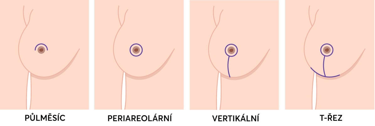 | Vertikální (tvar lízátka) | Kolem dvorce a svisle dolů k podprsní rýze (tvar „I“ nebo „L“) | Střední pokles (2. stupeň) | Velmi dobré, jizva je schovaná v podprsence/plavkách |